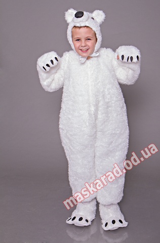 Ведмедик клишоногий, з дитинства всім знайомо. Усі знають, що на холодній півночі мешкають білі ведмеді. Великі, дуже сильні, хоч вони і хижаки, але ми їх однаково любимо. Шапка – маска з вушками, очима, носом. Білий хутряний комбінезон. Лапи на руки та на ноги.