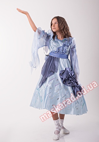 Ніжно-блакитний колір костюма створює легкість, легкість. М'яко спадаючі рукави прикрашені паєтками, сукня обшита камінням, чудовою вишивкою хмарки та парасольки нагадують, що негода - це не страшно.
